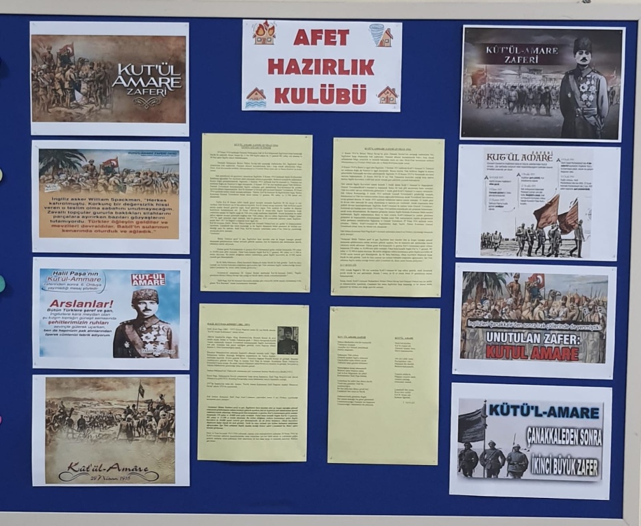 Kût'ül-Amâre Zaferi hakkında Afet Hazırlık Kulübü öğrencileri pano düzenlediler. Kulüp öğretmen ve öğrencilerimize teşekkür ediyoruz.
